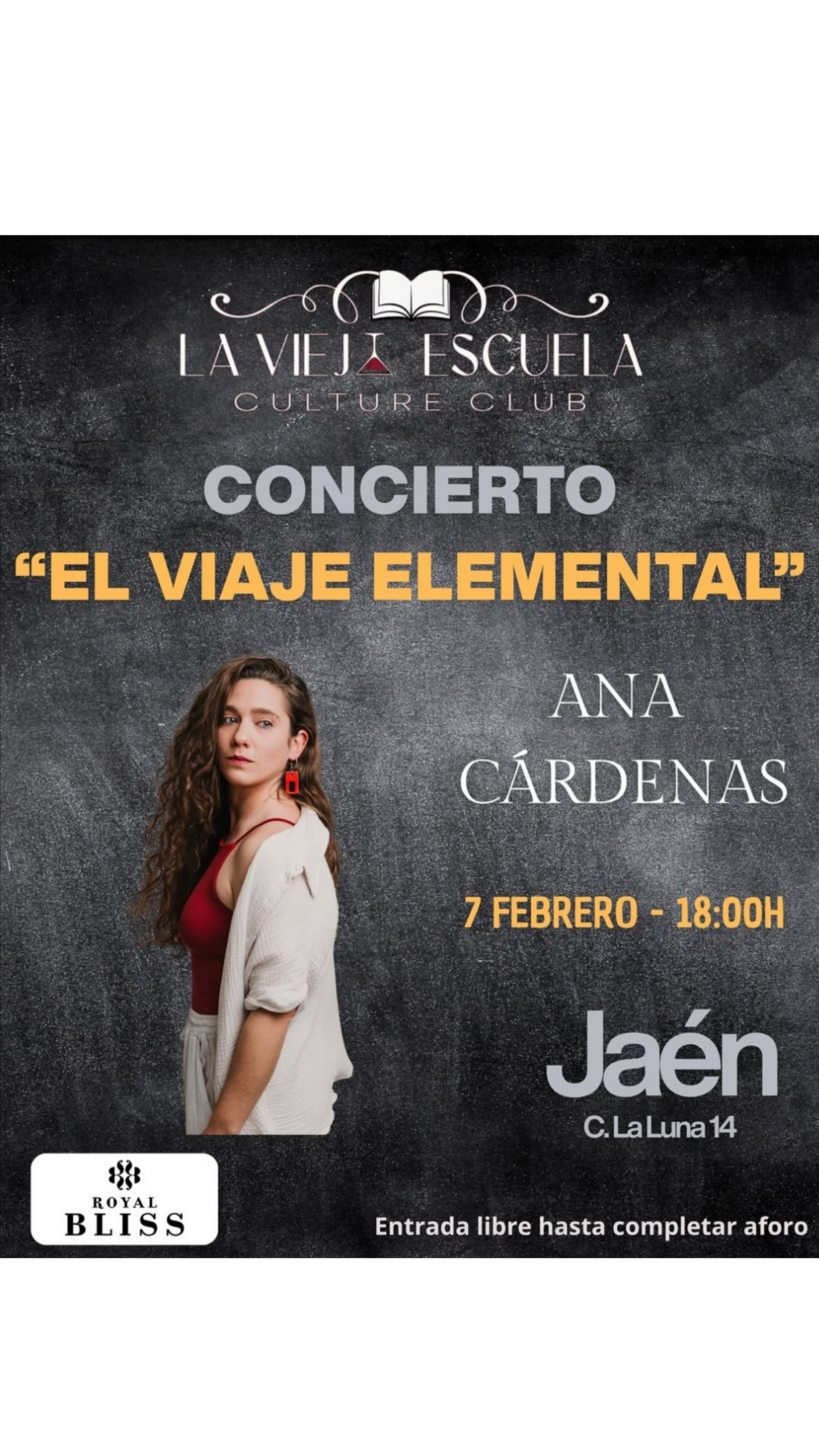 No podemos estar más emocionados, este sábado 7 de febrero a las 18:00 en La Vieja Escuela Culture-Club, nos espera un concierto que promete ser inolvidable con Ana Cárdenas presentando su nuevo proyecto «El Viaje Elemental», una propuesta íntima y cargada de sensibilidad que va directo al corazón.