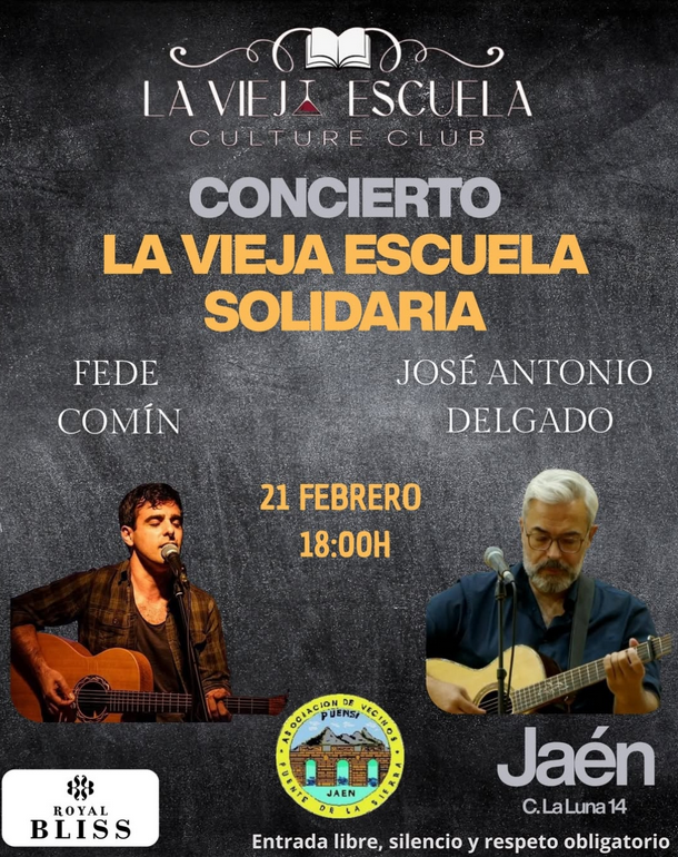 Tenemos un plan musical que nos apetece compartir con todos, este sábado 21 de febrero de 2026, a las 18:00, José Antonio Delgado y Fede Comín llenarán de melodía el espacio de La Vieja Escuela-Culture Club en Jaén con un concierto de canción de autor que promete momentos cercanos y llenos de letras que cuentan historias.