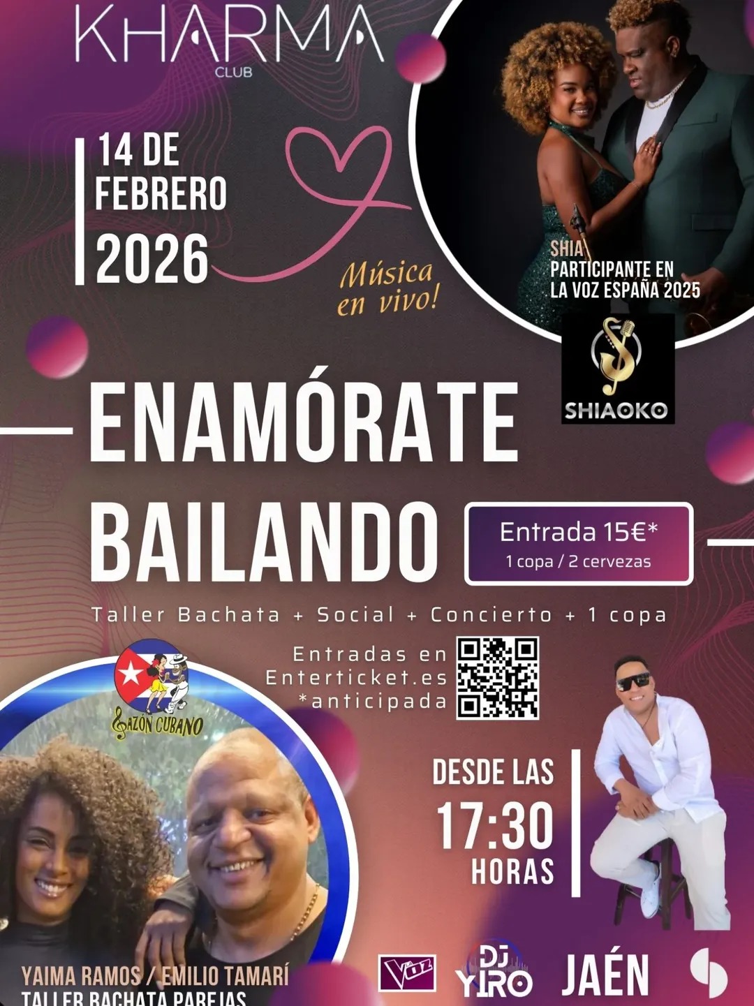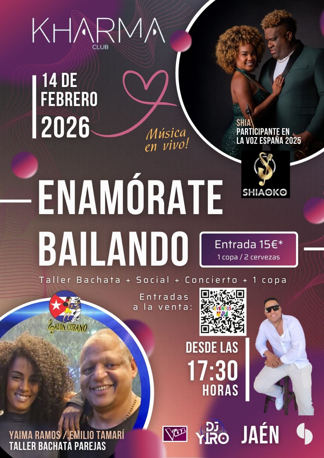 Celebra el 14 de febrero en Sala Kharma con una jornada dedicada exclusivamente a la música cubana y el baile. El evento ofrece una programación técnica y recreativa desde las 17:30 hasta las 23:00.