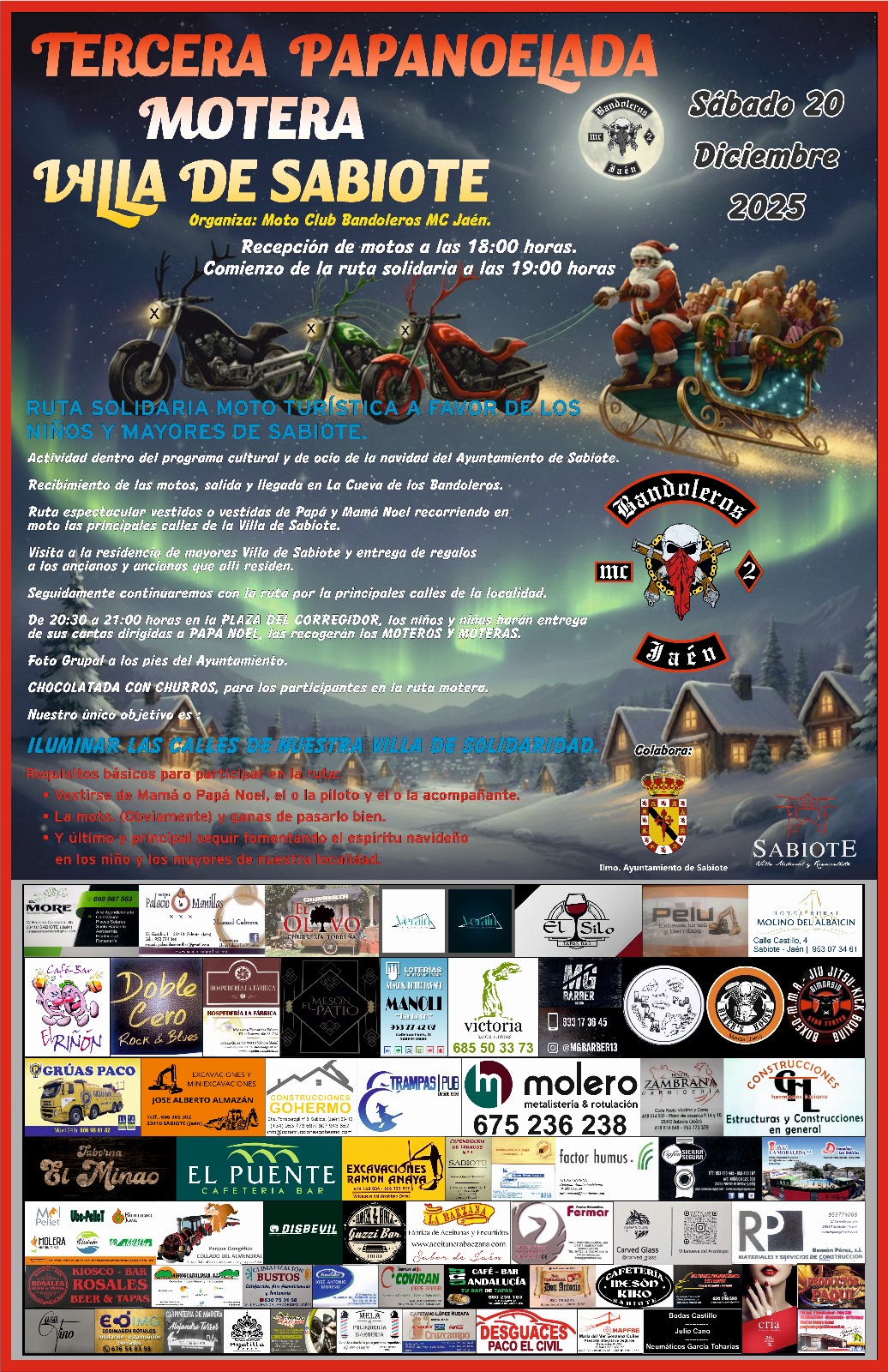 Sabiote vuelve a encender la ilusión con su Tercera Papanoelada Motera, un evento solidario organizado por Moto Club Bandoleros MC Jaén que llenará las calles de espíritu navideño, motos, alegría y mucha solidaridad.
