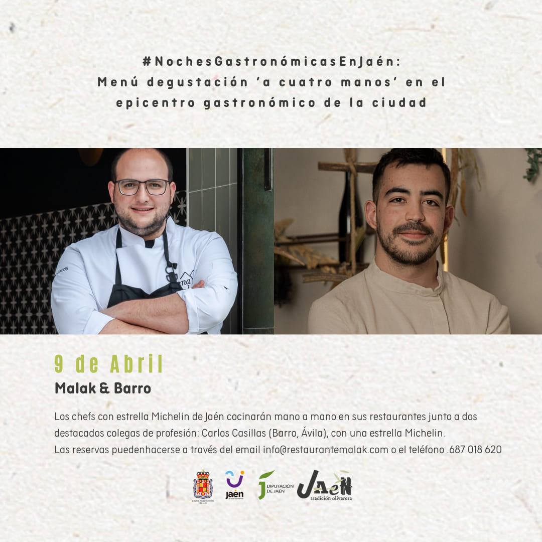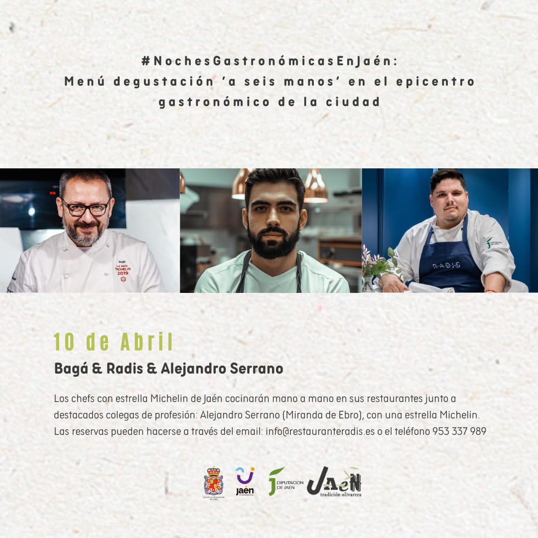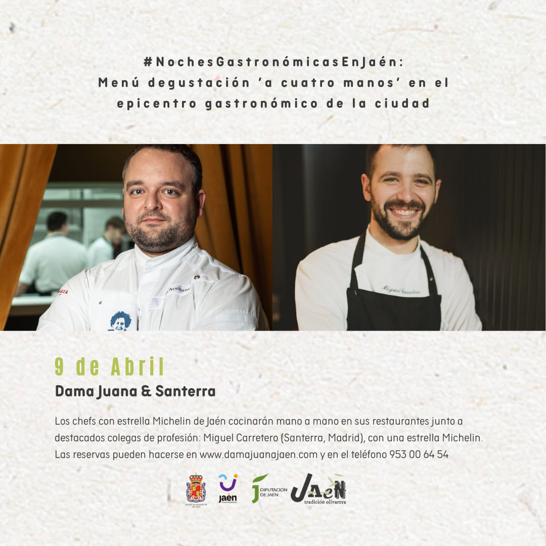 Los días 9 y 10 de abril los amantes del buen yantar tienen una cita culinaria con la propuesta Noches Gastronómicas en Jaén y «7 Estrellas Michelín», un encuentro que pretende dar apoyo a la candidatura de Jaén a Ciudad Creativa de la UNESCO en la categoría de gastronomía. La cita contará con los chefs: Pedro Sánchez ( Bagá), Juan Aceituno ( Dama Juana), Javier Jurado (Malak), Juanjo Mesa ( Radis)