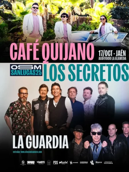 El viernes 17 de octubre será una de las fechas más destacadas de la feria, con un cartel formado por tres referentes imprescindibles de la música española. Café Quijano, el reconocido trío leonés que alcanzó fama internacional con La Lola y continúa en plena forma con su reciente trabajo Manhattan, encabezará la noche. Le seguirán Los Secretos, emblemas de la Movida Madrileña y autores de temas inolvidables como Déjame y Pero a tu lado. Cerrará la velada La Guardia, la mítica banda granadina de pop rock que marcó los años 80 con Mil calles llevan hacia ti y que celebra junto al público jiennense más de treinta años de trayectoria musical.