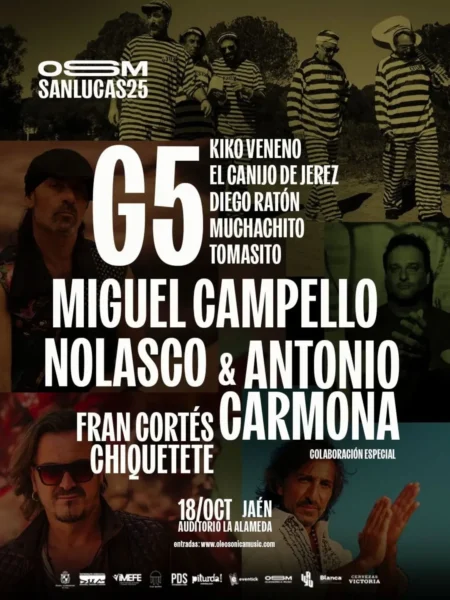 El 18 de octubre, con motivo del Día de San Lucas, el Auditorio de la Alameda será el escenario de una jornada dedicada a la música alternativa con alma flamenca. El cartel reúne a figuras destacadas del género, con el regreso del supergrupo G5 y las actuaciones de Miguel Campello, Nolasco y Fran Cortés, en una cita donde resonarán himnos de Los Delinqüentes y otros grandes artistas. G5 —formado por Kiko Veneno, Los Delinqüentes, Muchachito y Tomasito— presenta su nuevo trabajo El que quiera dormir que se compre una colchoneta, mientras que Miguel Campello, exvocalista de Elbicho, continúa su carrera en solitario con una fusión de flamenco, jazz y pop. Nolasco, cantautor sevillano, compartirá temas de su próximo disco Henko, y la velada se abrirá con Fran Cortés, miembro de la familia Pantoja, que desplegará su talento y raíces profundamente flamencas.